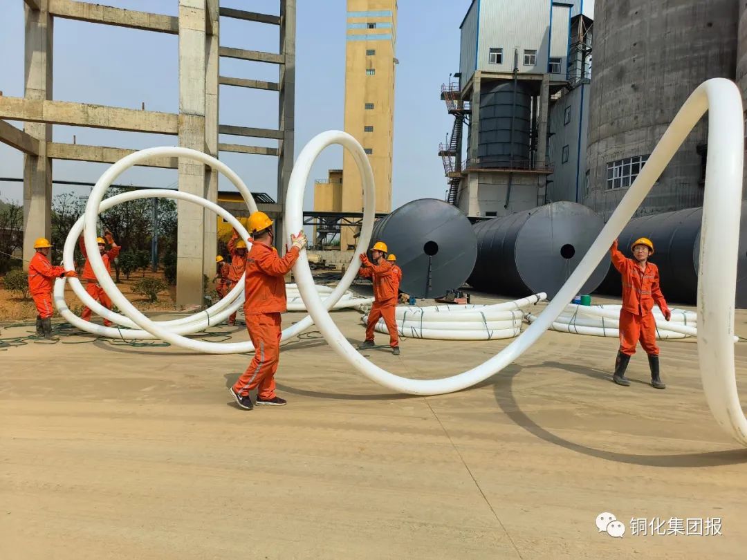 在施工現場,工人師傅們或肩扛,或手拉,全力完成管道鋪設任務。充填管道盤起來時直徑較大,運輸起來很麻煩;管道壁較厚,捋直也是對技巧、體力和耐力的考驗。師傅們將洗潔精涂在內接外壁上進行潤滑,一絲一絲將內接塞入管道內。卡箍、拉桿等每一道工序都需要細致檢查,才能確保接好的管道投用后無“跑、冒、滴、漏”現象。在大家的共同努力下,三百多米的充填管道很快鋪設完畢,為后續負36米平臺新建水泵房的邊坡支護及采坑生態修復創造了條件。